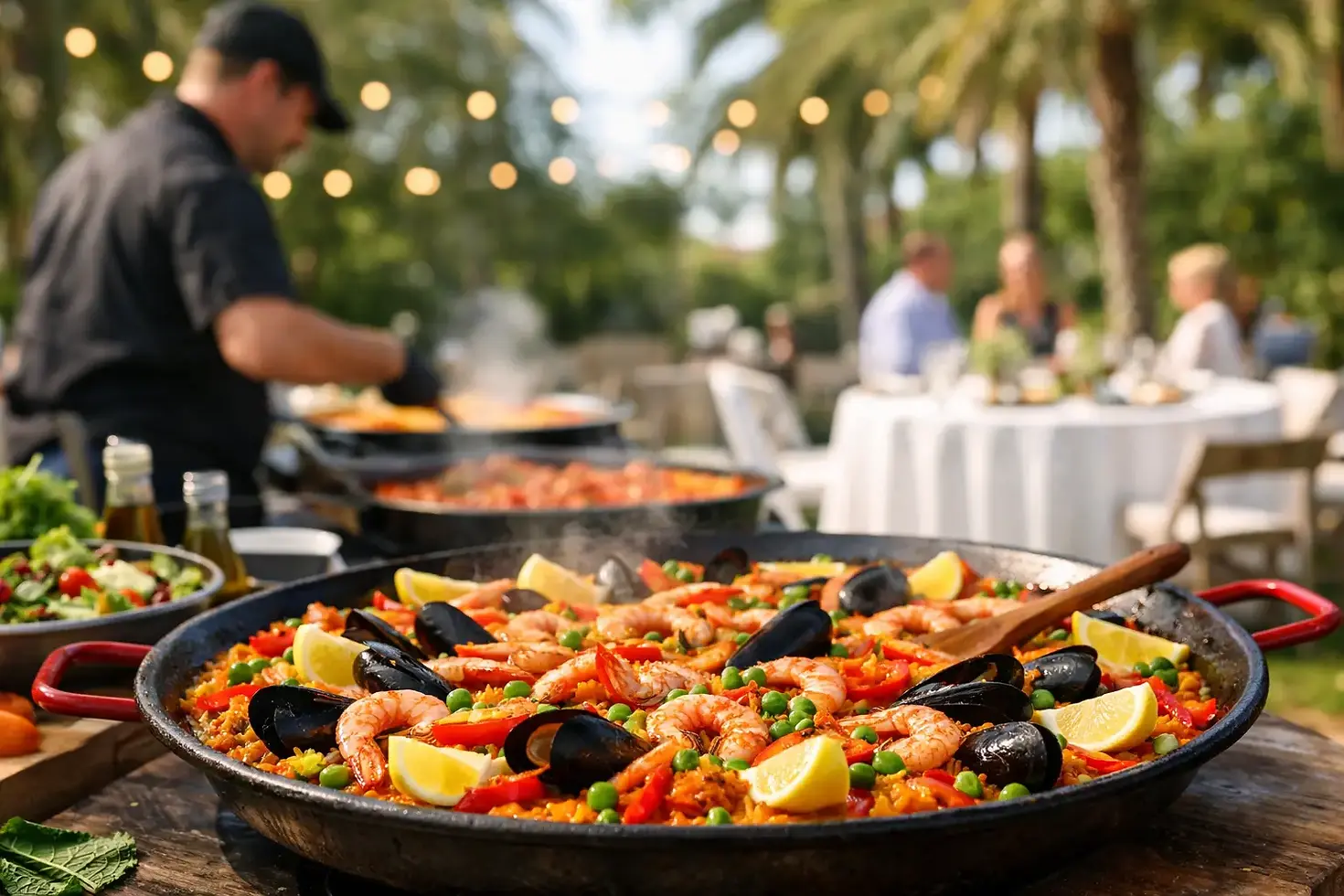 Paella creates a different kind of atmosphere than typical buffet service. When guests see a wide pan set up on-site, hear the sizzle, and catch the scent of saffron, seafood, chicken, or vegetables as the dish comes together, the food becomes part of the celebration itself. People gather around. They ask questions. They take photos. The meal starts before the first serving is plated.